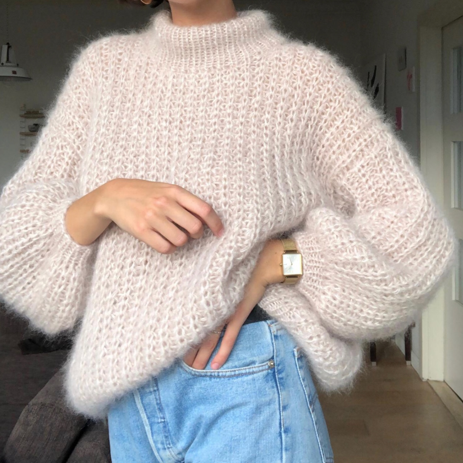Half Patent stitch has a pronounced deep, structured texture, providing both warmth and volume. Loose-fitting silhouette with a ribbed turtleneck collar and wide inset sleeves.